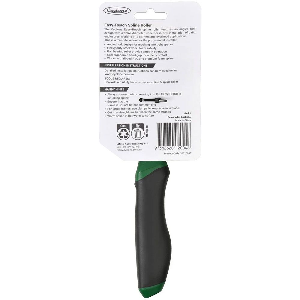 The Cyclone Easy-Reach spline roller features an angled fork design with a small diameter wheel for in-situ installation of patio enclosures, working into corners and overhead applications. This is a must-have tool for the professional contractor.