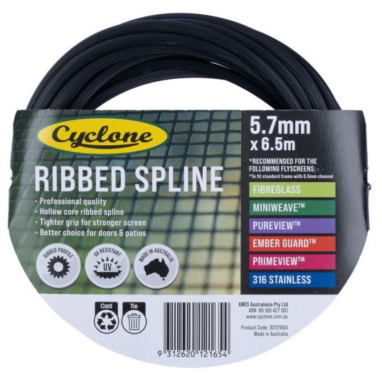 Cyclone Tufflite spline is a professional quality, hollow core ribbed spline made from soft UV resistant PVC. Ribbed spline provides a tighter grip to withstand more force. Most suitable for doors or patio enclosures prone to impact.