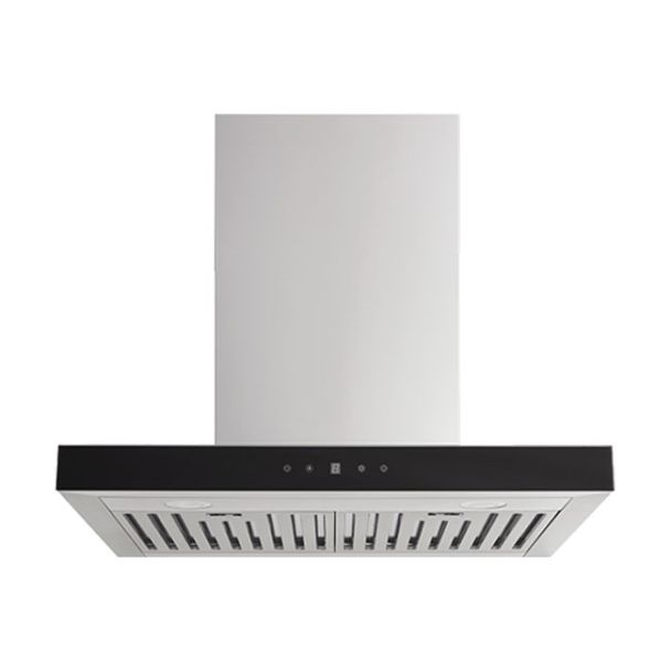 A stainless steel flat canopy with black glass panel gives this rangehood a modern sleek look.