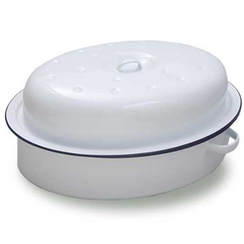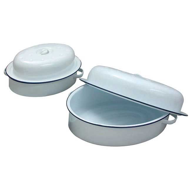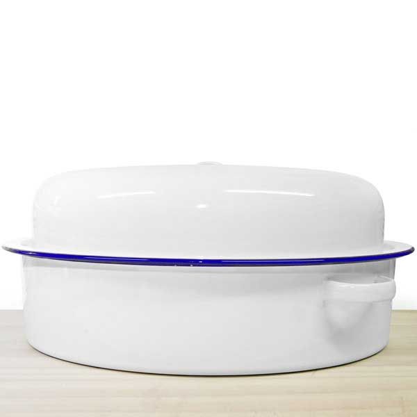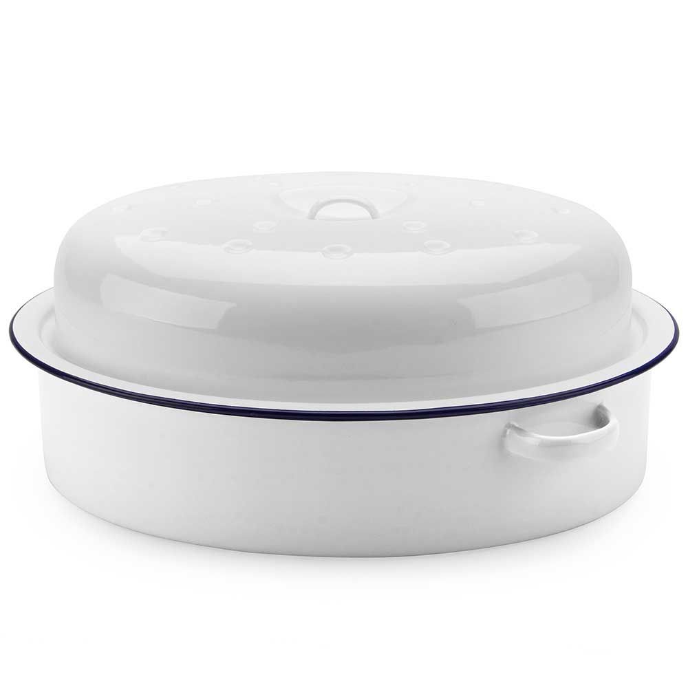 Falcon Enamelware 36cm Oval Roaster in White with Blue Rim