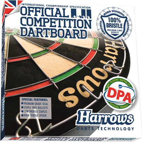 The Harrows Official Competition bristle board is made to International Matchplay Standards. This round wire board has a staplefree bullseye which reduces the chance of dart bounceouts and it is the dartboard of choice for sharp shooters worldwide. DPA approved.
