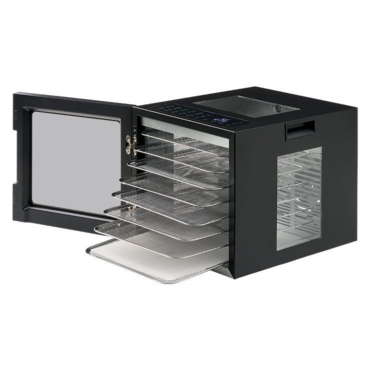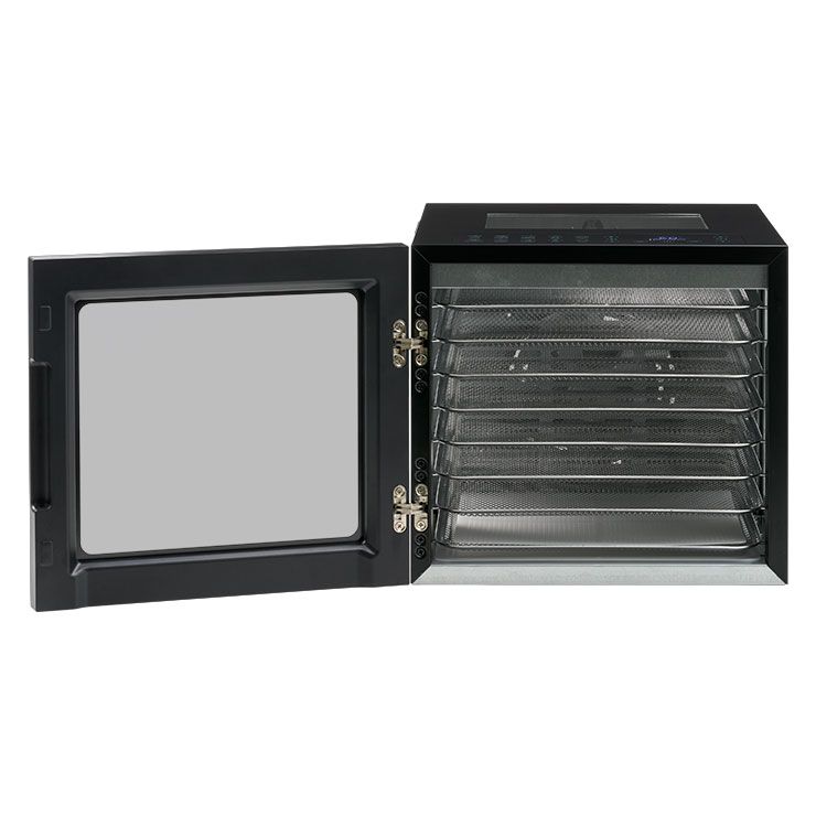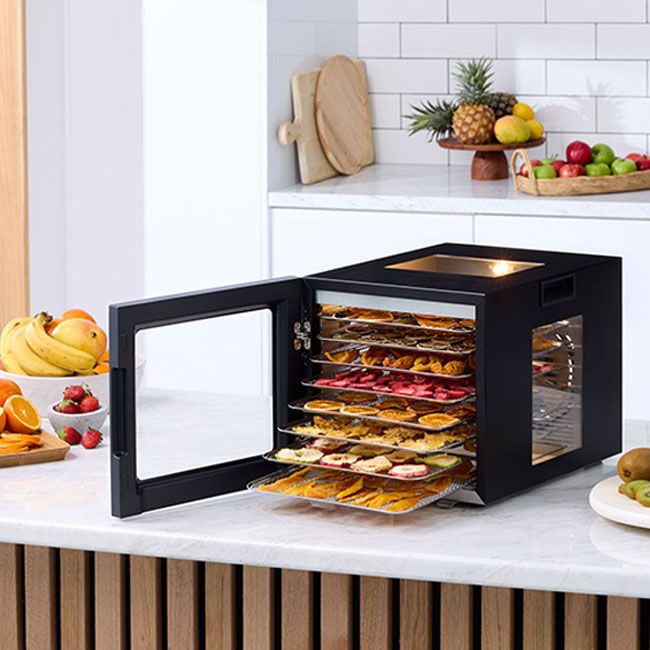 This high-quality, sturdy metal dehydrator features 8 stainless steel shelves that gently remove moisture from fruits, vegetables, meats, fish, herbs, and spices using controlled low-temperature heat. Choose from 10 preset cooking programs or customise the settings to your preference, sealing in natural flavours and nutrients for highly nutritious, vitamin-rich snacks.