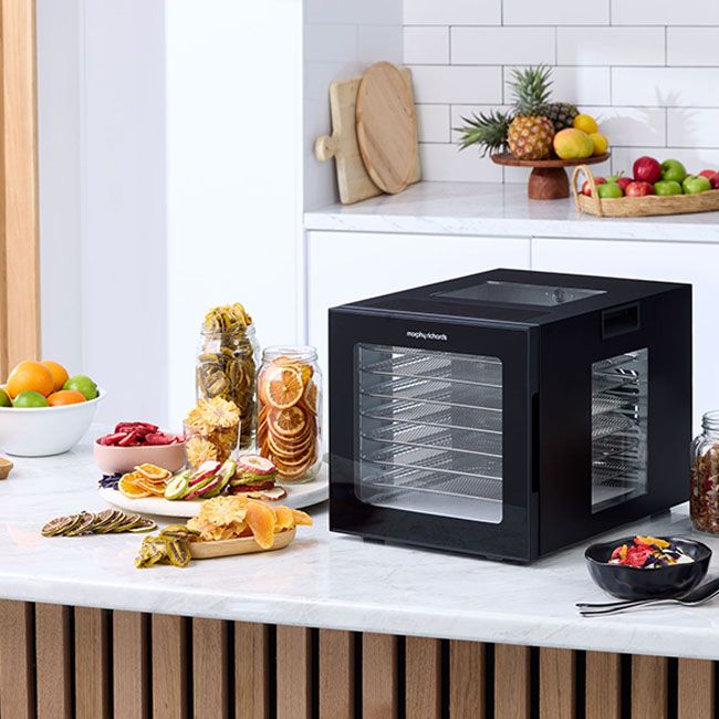 With a transparent door and windows, an inner lamp, a 48-hour timer, and adjustable temperature settings, the Morphy Richards dehydrator is the perfect addition to your kitchen for healthy, delicious snacking!
