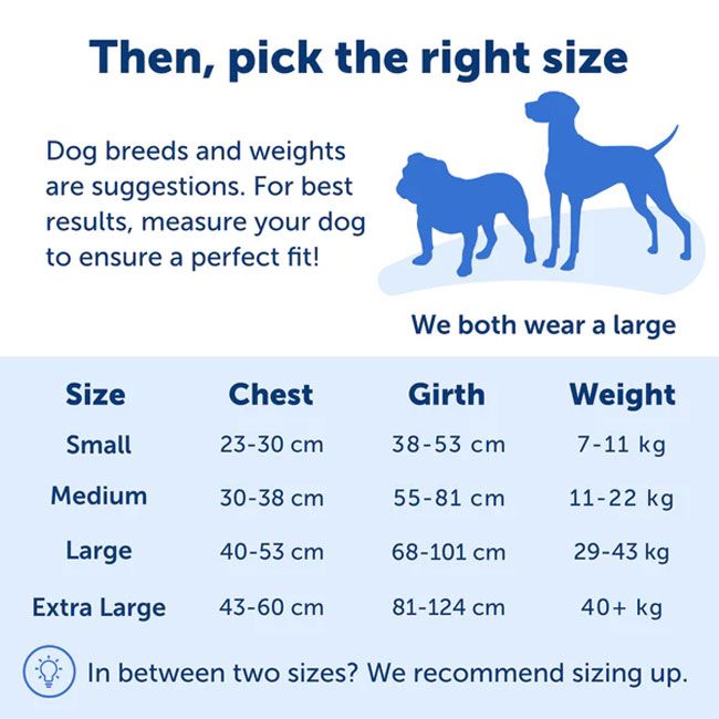 To determine what size Easy Walk Harness your dog will need, you'll need 2 measurements. First, grab a fabric or soft tape measure and wrap it around your dog's girth, which is the widest part of your dog's chest right behind his front legs. Next, wrap the measuring tape horizontally across the front of your dog's chest until it's an inch past his front legs. Take note of both measurements and check the sizing chart (in additional product photos) to see which size best fits your dog