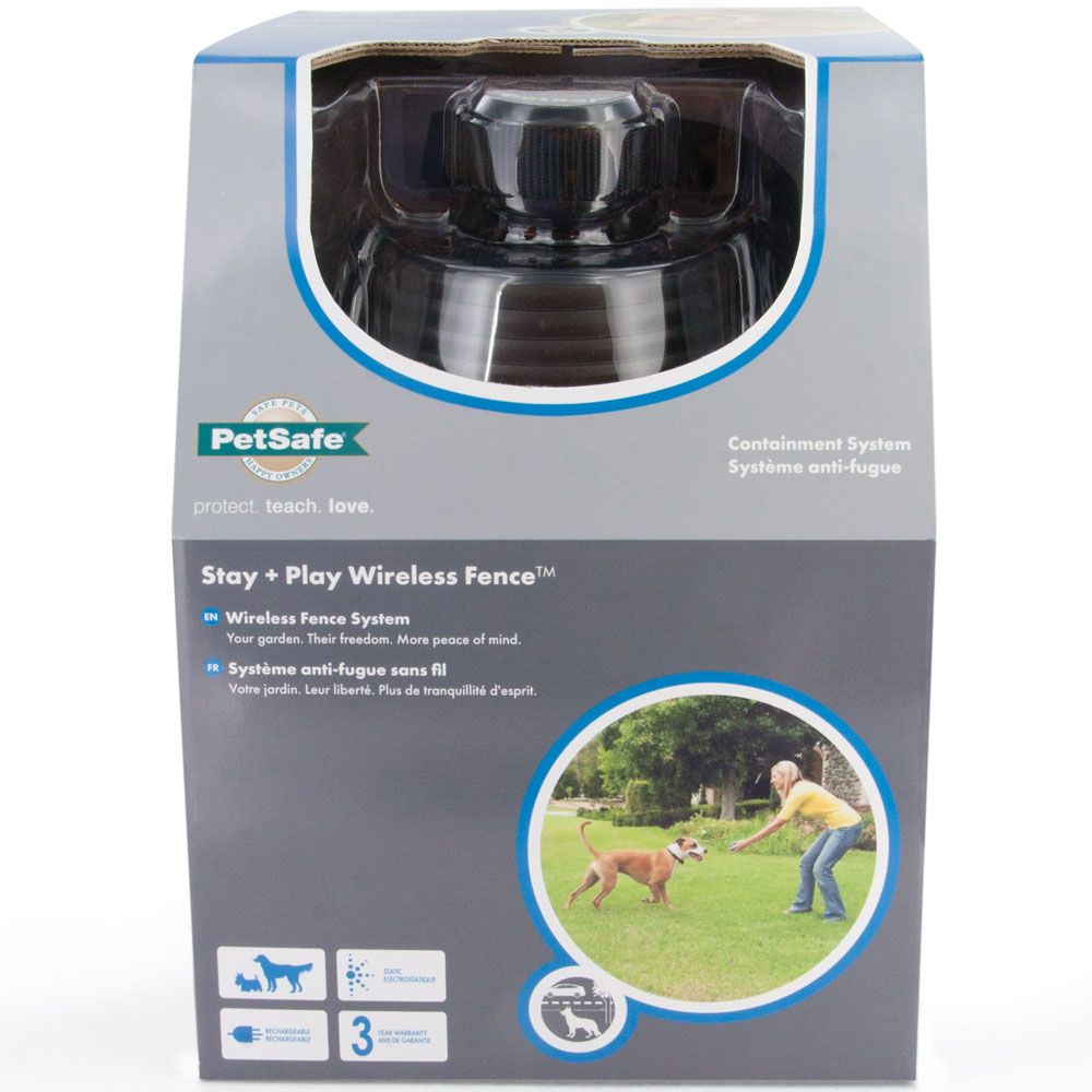 The PetSafe Stay + Play Wireless Fence has been proven safe, effective and comfortable for dogs over 2.3 kg. This innovative portable system allows an unlimited number of dogs to be added (with additional receiver collars). The system, which has no wires to bury, communicates to dogs when they are approaching the perimeter of the 'pet area' - first by an audible tone and then by harmless static simulation to gain the pet's attention.