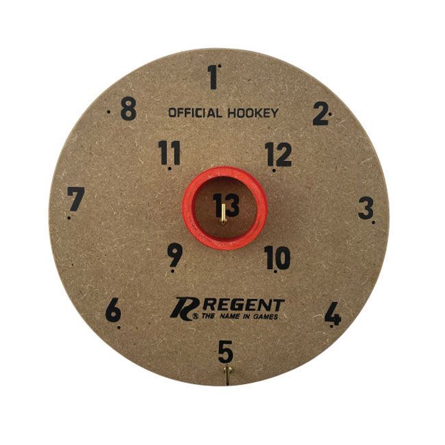 The Hookey Set includes the board measuring 28cm in diameter and 2cm in depth, with the numbered scores on it, thirteen steel hooks with a depth of 6.5cm and eight rubber rings.