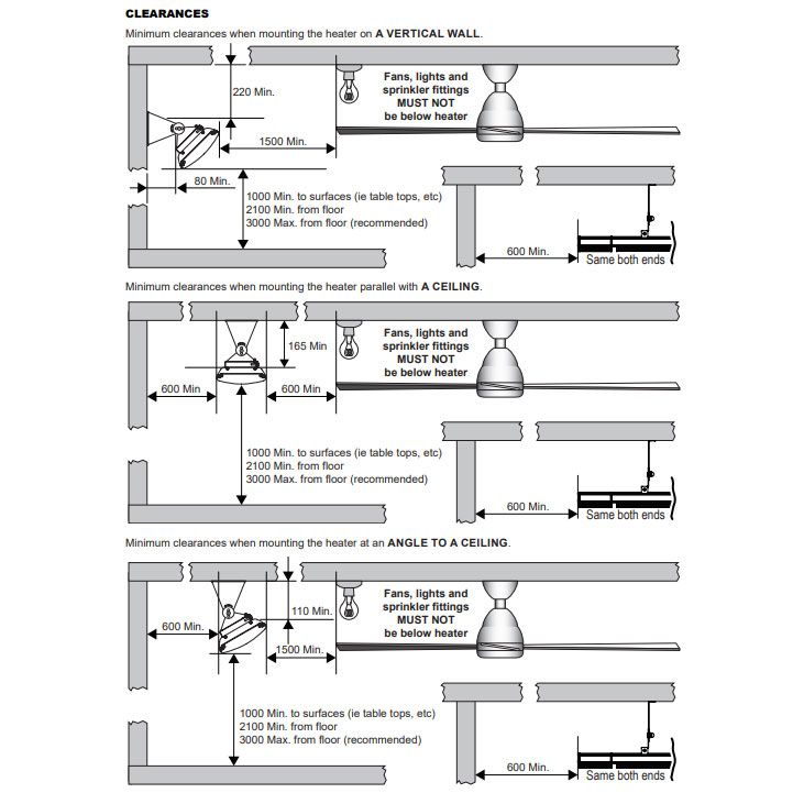 Fans, lights and sprinkler fittings must not be below the heater. Minimum mounting clearances can be found in the images of the product.