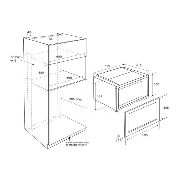 - Dimensions: 595mm ( W) x 388mm (H) x 410mm (D) including trim kit